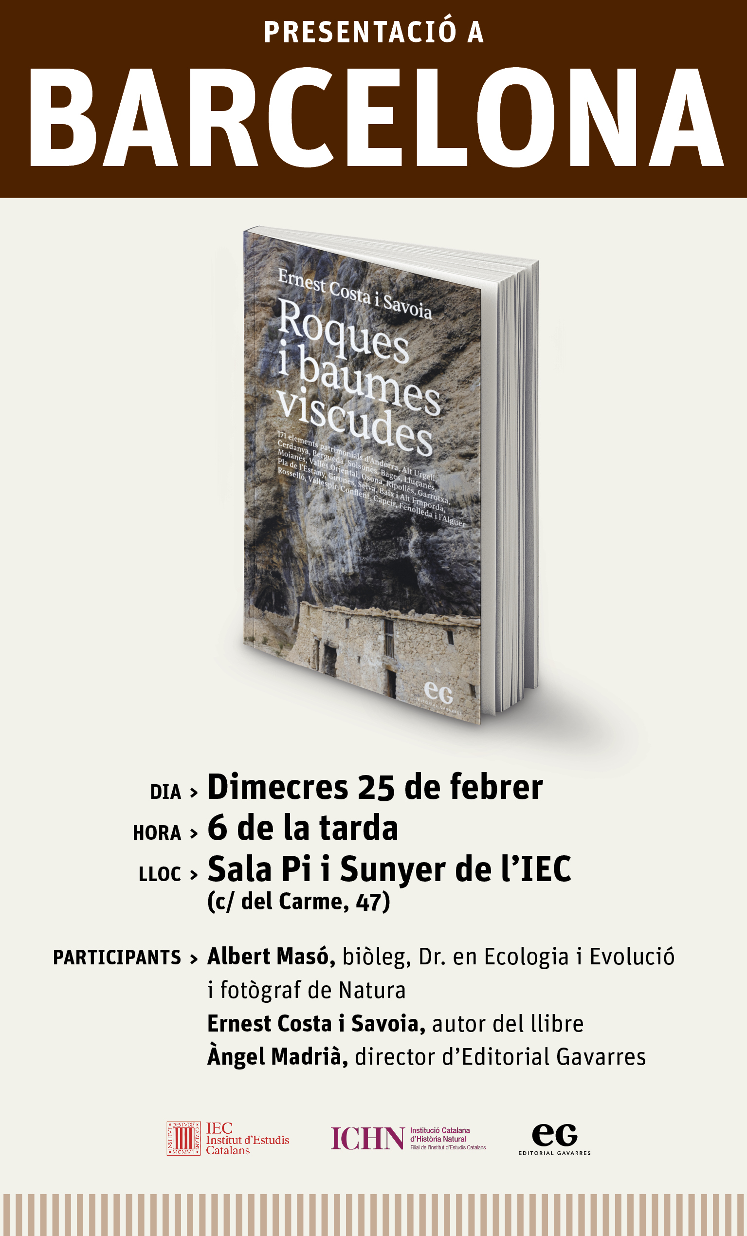 Us convidem a la presentació del llibre “Roques i baumes viscudes”, d’Ernest Costa el dimecres 25 de febrer de 2026 a les 6 de la tarda a la Sala Pi i Sunyer de l’IEC (Carrer del Carme, 47). Hi intervindran Albert Masó, biòleg, Dr. en Ecologia i Evolució i fotògraf de natura; Ernest Costa i Savoia, autor del llibre; i Àngel Madrià, director d’Editorial Gavarres.